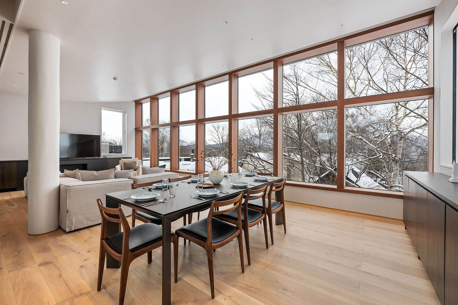 The top floor forms the heart of the home. An expansive open-plan living, dining, and kitchen area is framed by floor-to-ceiling windows, offering breathtaking panoramic views of Mt. Yotei.
