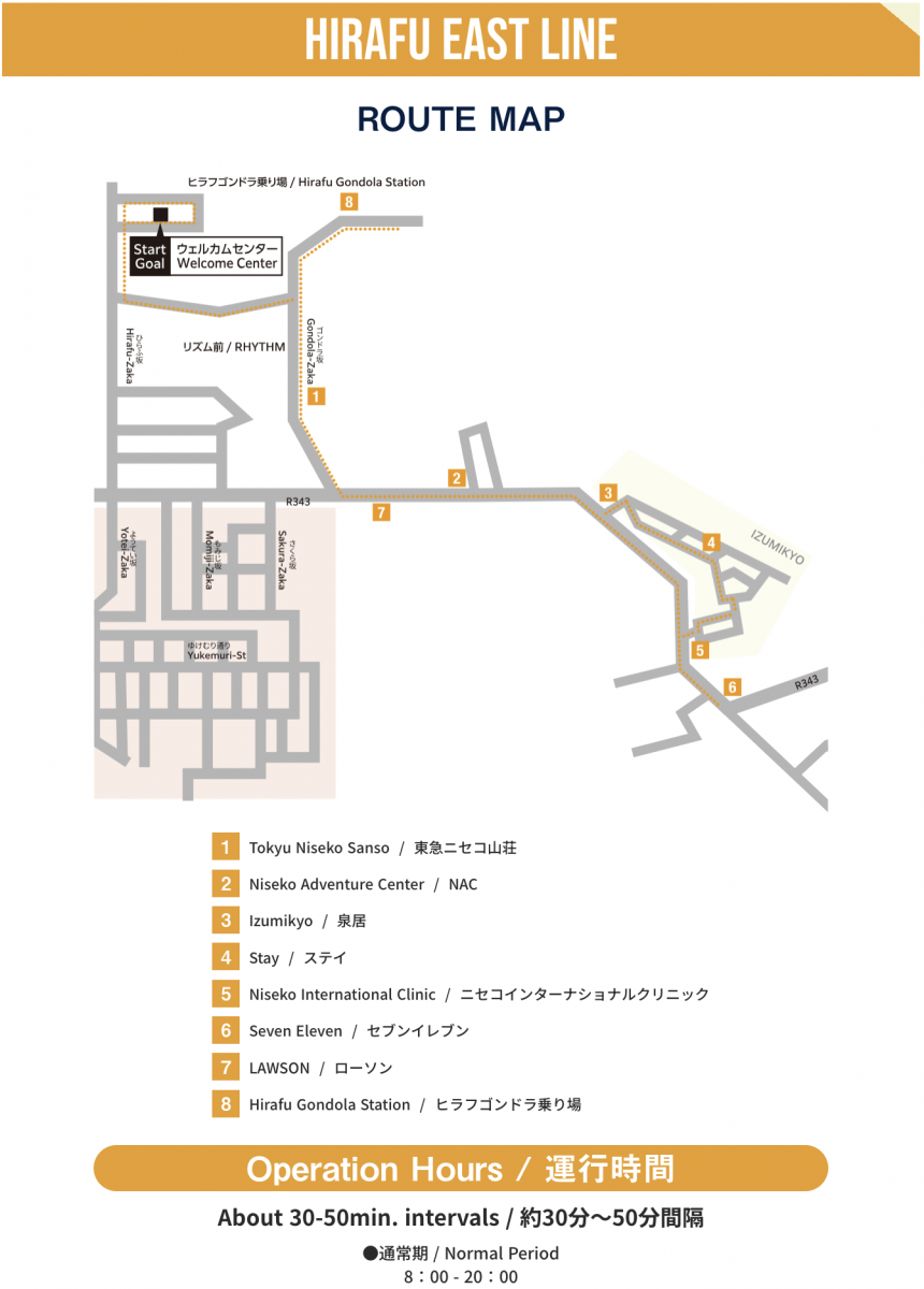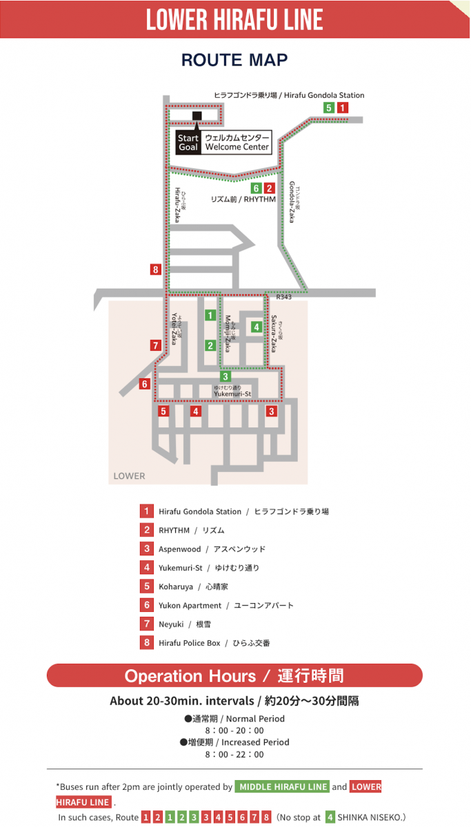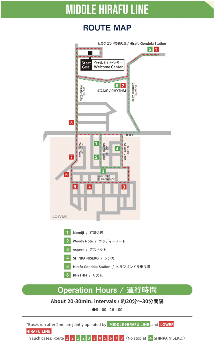 - Hirafu Shuttle Bus – multiple routes operating connecting the different neighbourhoods of Hirafu and the Hirafu ski lifts